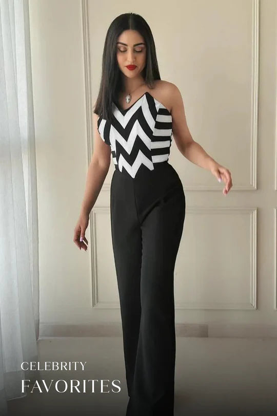 Quickshop This sleek jumpsuit features a foldable collar, V-neckline, and daring V-cutout at...
