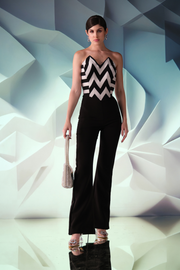 Embrace a bold and sophisticated look with this unique outfit. The herringbone striped corset with added boning ensures a perfect fit, while the straight-fit trousers elongate your silhouette. The asymmetric neckline adds a touch of edginess, making this outfit perfect for a night out or a fashion-forward event.